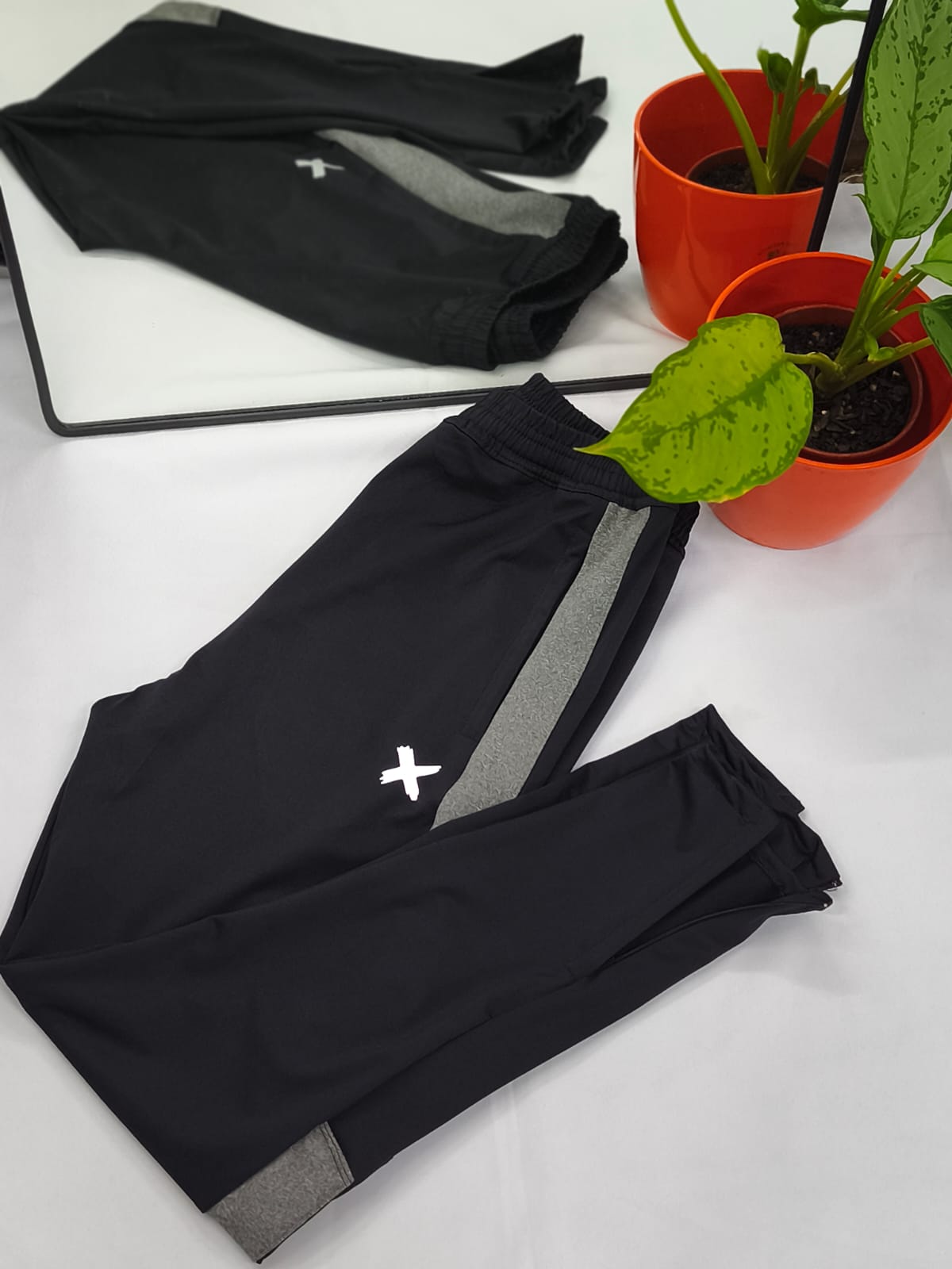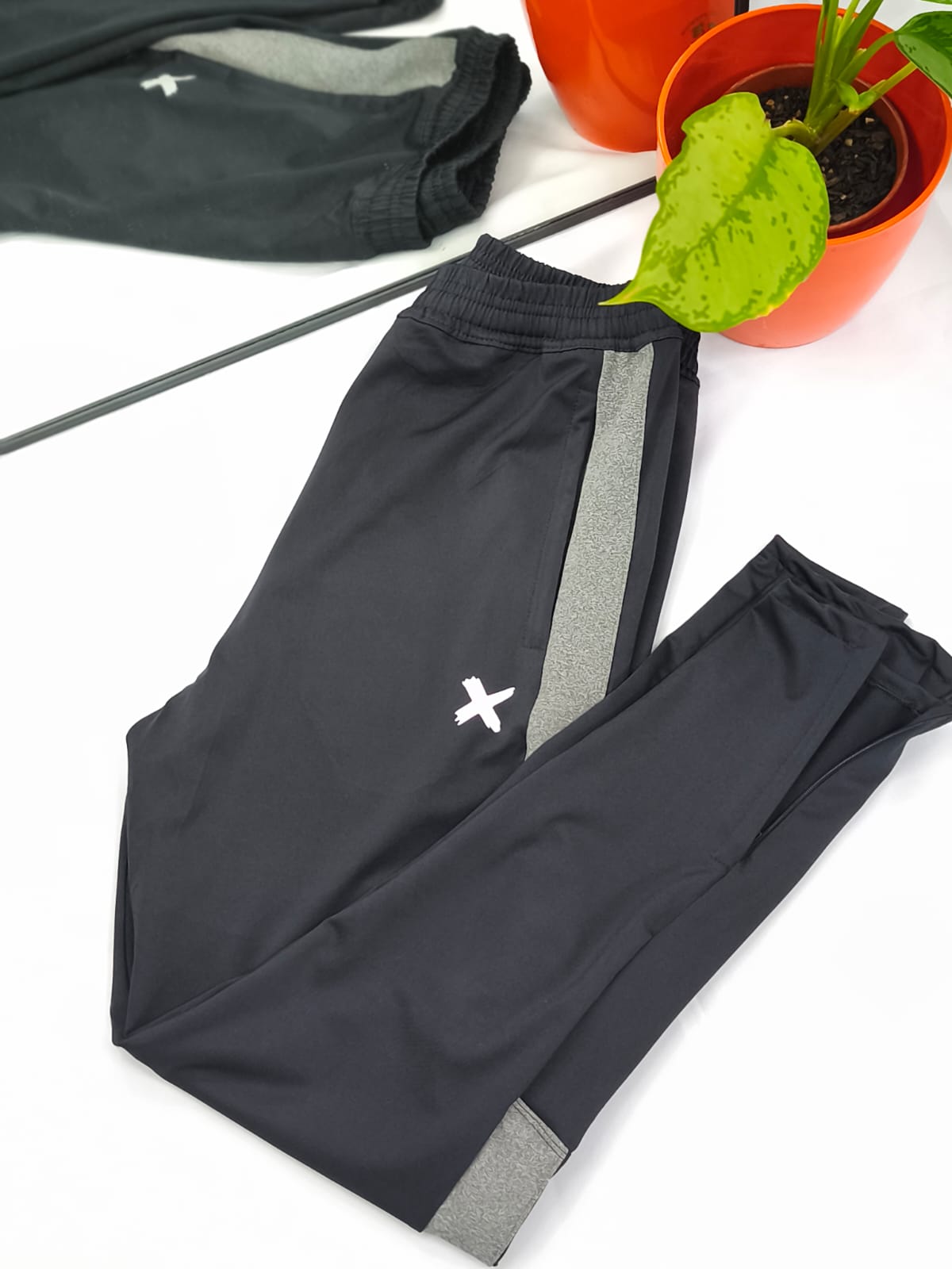 Detalles Premium: Logo “X” en contraste y franjas laterales en gris melange que resaltan sobre el negro.